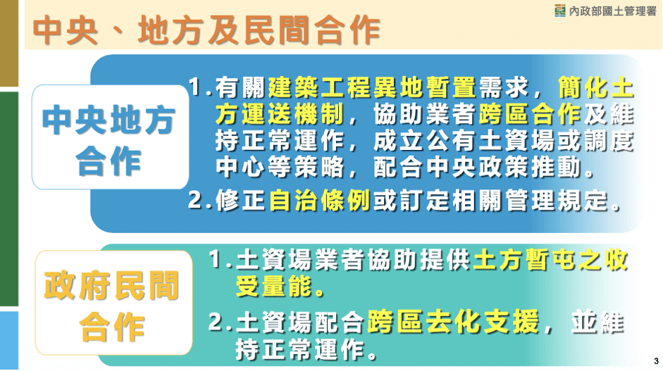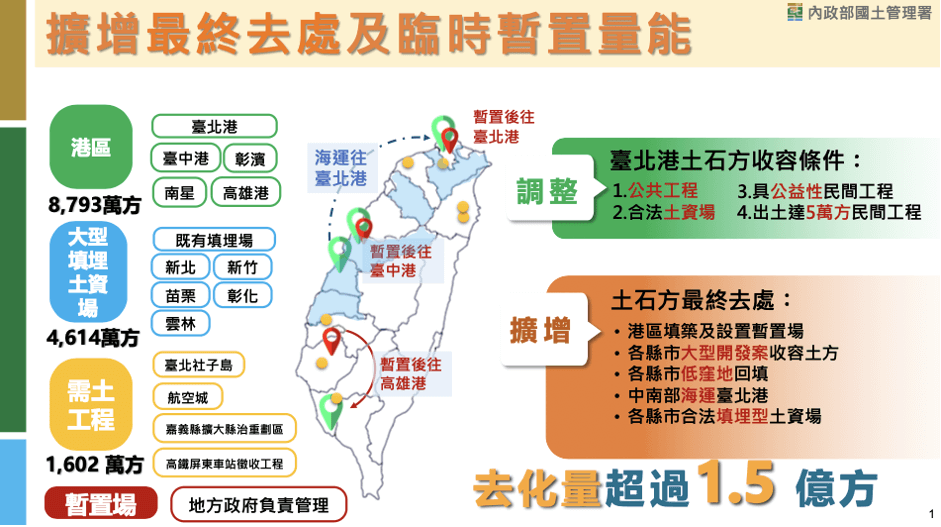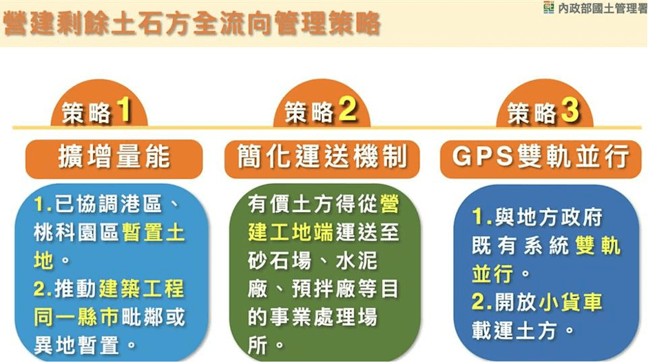 第二,擴增合法暫置與處理量能:1/1開始,所有土方都必須進合法場位,但合法場地本來就不足,瞬間供不應求,價格自然飆升,1/29的措施就是,加速釋出與擴充土方暫存以及處理廠得合法場位,避免工程因土沒地方去而全面停擺。