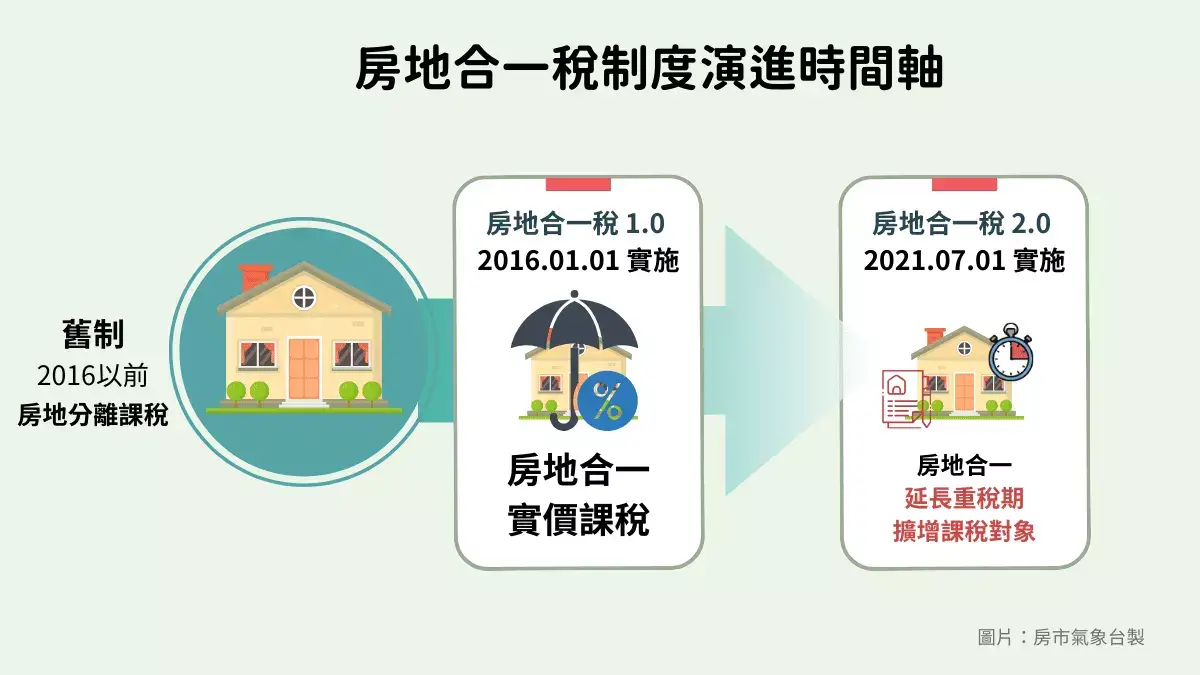 - 2021年7月1日:房地合一稅2.0正式實施,透過延長短期交易的重稅閉鎖期,大幅提高短期轉售的稅負成本,藉此大幅強化「打炒房」的政策目的。