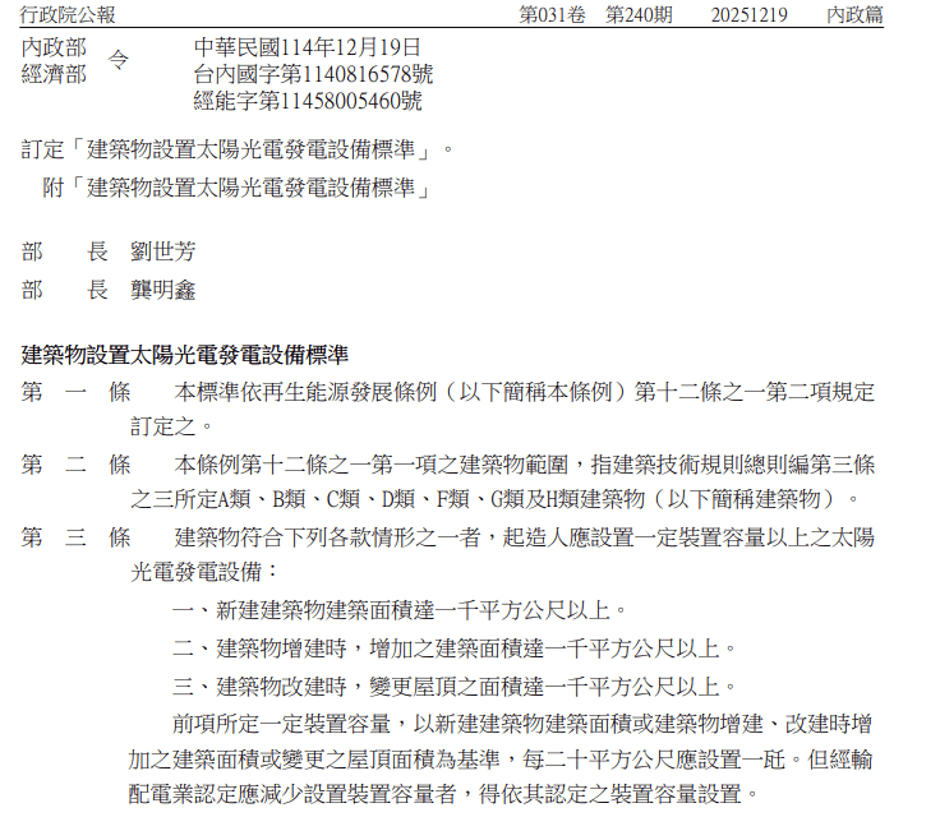 《建築物設置太陽光電發電設備標準》預計在2026年年中正式上路,凡新建、增建或改建面積達1,000平方公尺以上的建築,都必須依規定設置一定比例的太陽光電設備,這個政策算是整個新建市場的共同起跑線,從現在開始,「有沒有做綠能」不再是品牌加分項,而是合規的基本條件。