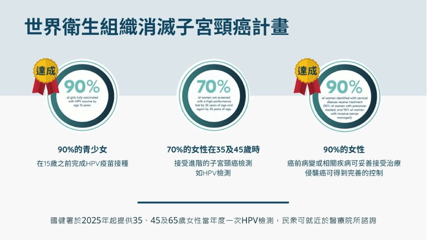 透過疫苗做為第一道防線,搭配成年或是有性經驗後定期接受抹片檢查,甚至可以進行更精密的HPV檢測,三管齊下的防癌手段獲得國際間高度認同,於是2025年起,國健署也進一步在35、45及65歲提供民眾當年度的HPV檢測,期盼能在有細胞病變前就抓出風險,降低病變的機率。