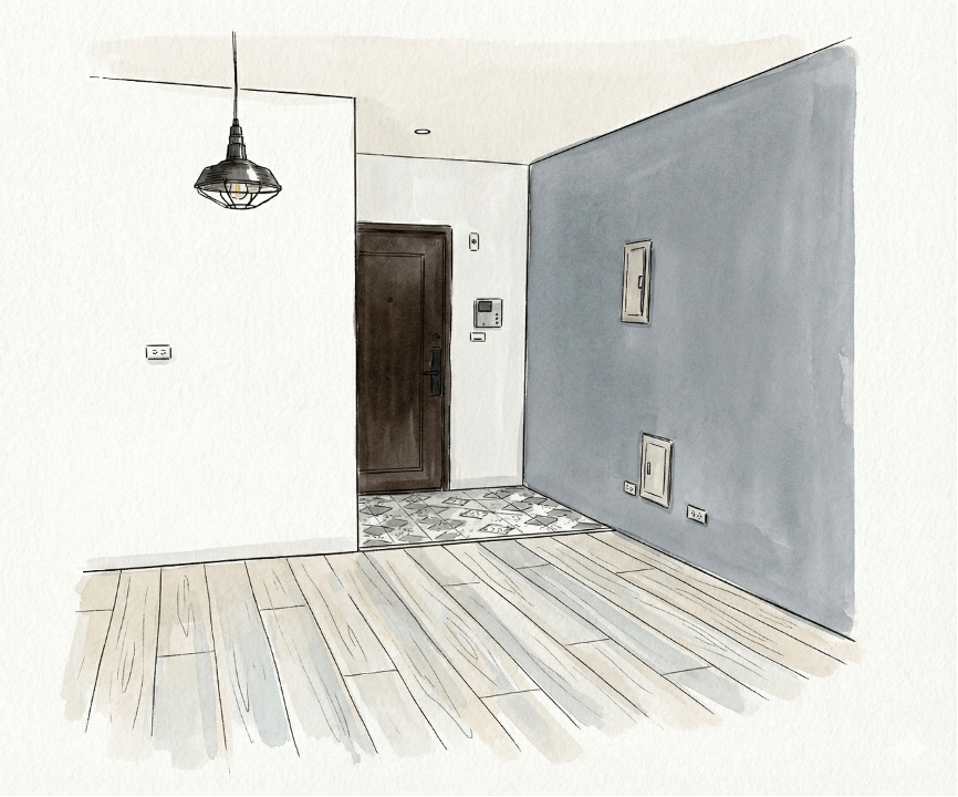 居家設計的起點,在於「天地壁」的設定。我先處理天花板與燈光,決定好色溫與照明層次,確保空間能在白天與夜晚間自然切換。地板選用淺色耐用的木質,維持室內明亮清雅,同時保有赤腳踩踏的溫潤感。牆面則在單側進行低彩度的莫蘭迪藍跳色,確立了冷色調的基調,也讓後續家具的配色與尺寸選擇變得輕鬆直覺 。