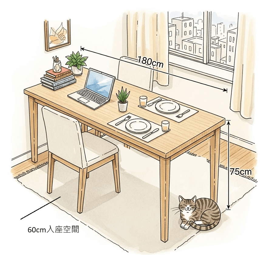- 多功能長桌:要買餐桌與工作桌,不如改選一張 180 公分長、75 公分高的精緻長桌,功能疊加。工作時專注當下,用餐時則迅速收納物品。要注意桌後需保留 60-70 公分的入座空間。