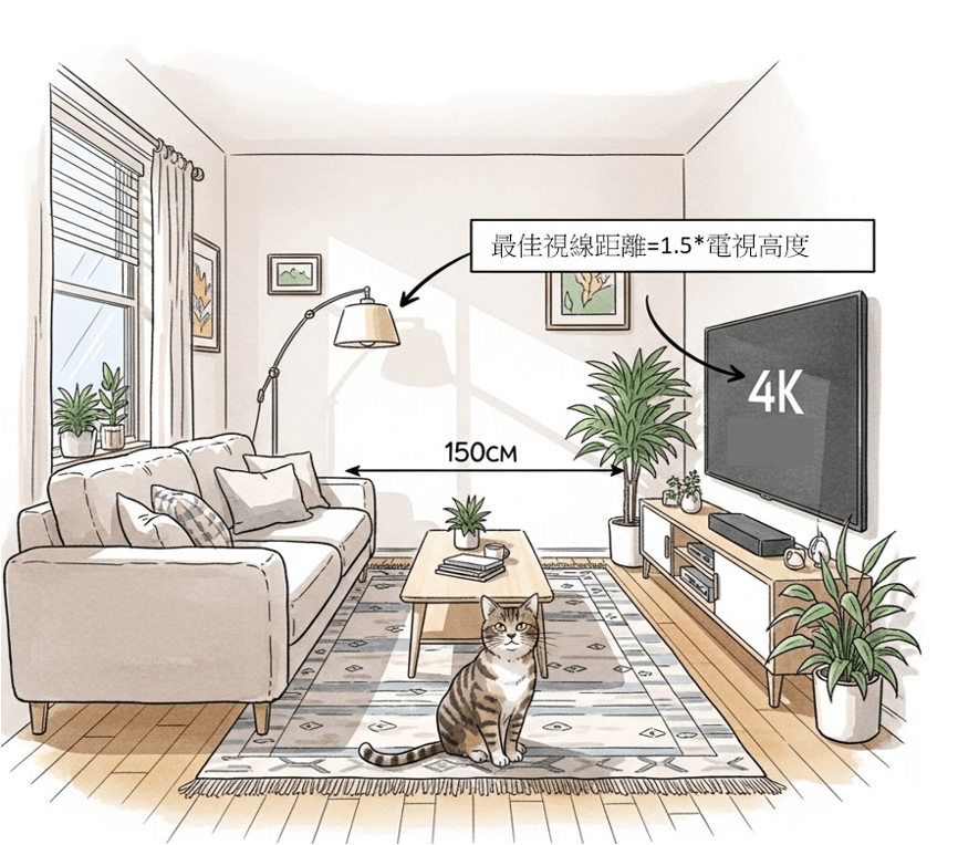 - 視覺動線優化: 觀賞距離一定要取好,例如對於我家而言,沙發距離電視牆面只剩下150公分,因此建議電視尺寸選擇43-50吋即可。(最佳觀賞距離為電視高度的 1.5 倍)。