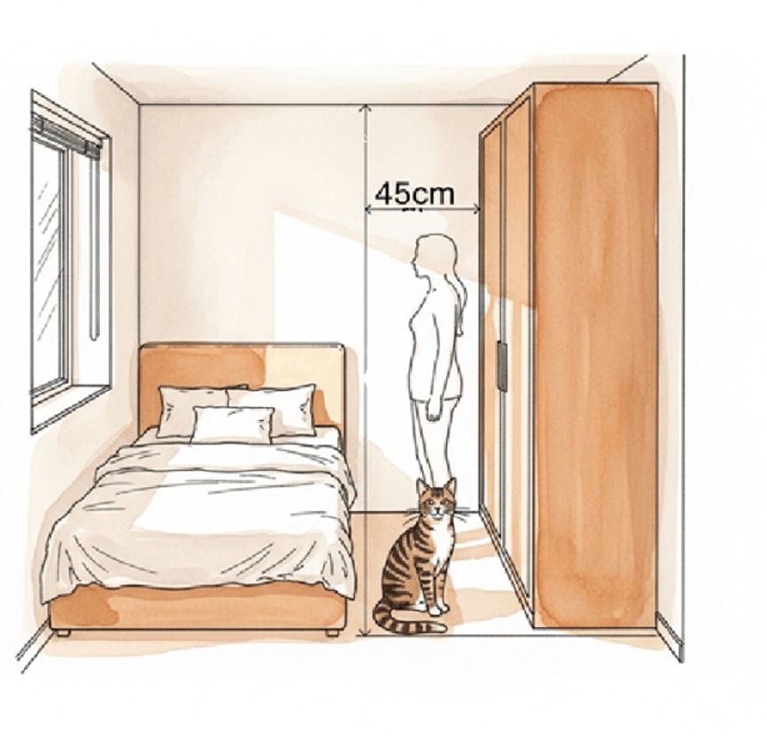 - 複合衣櫃:臥室床舖靠牆,單側上床能留出整面衣櫃空間;搭配滑門設計,再保留 45 公分的窄側空間內,依然能維持順暢動線 。