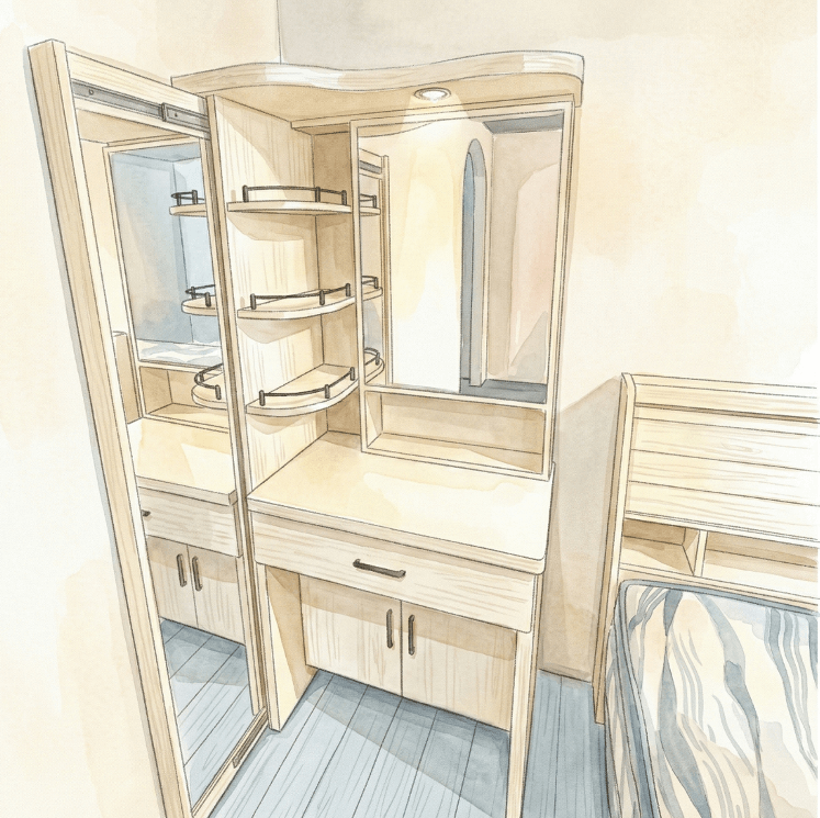 - 多合一櫃體:梳妝櫃內嵌全身鏡,不使用時收回櫃體,維持視覺清爽 。